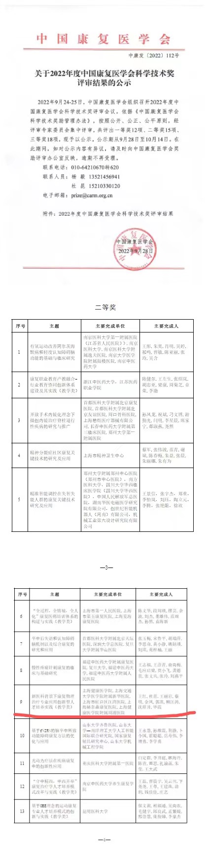 近日,中国康复医学会公布了2022年度科学技术奖评审结果,共评出一等奖12项,二等奖15项,三等奖18项。由我校康复学院副院长王红副教授牵头,联合上海交通大学医学院附属新华医院、上海市虹口区江湾医院、上海赫尔森康复医院、上海健康医学院附属周浦医院共同申报的项目《新医科背景下康复物理治疗专业应用创新型人才培养实践》经过答辩、专家层层评选,最终荣获二等奖。