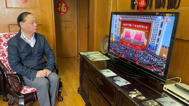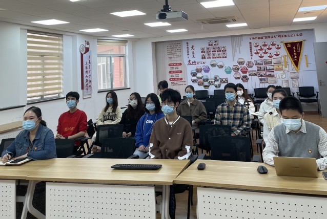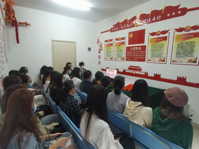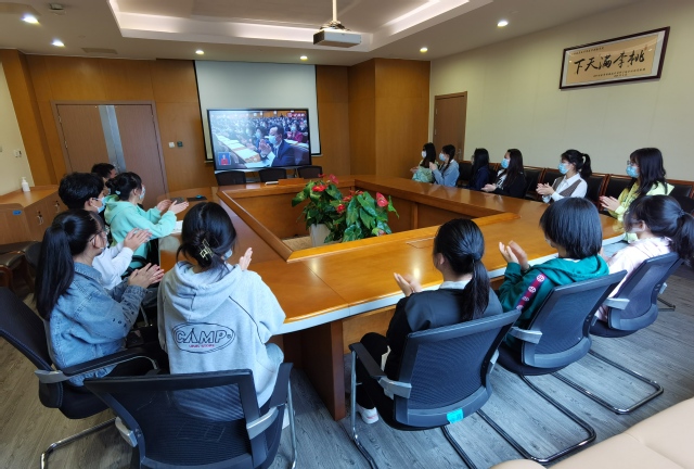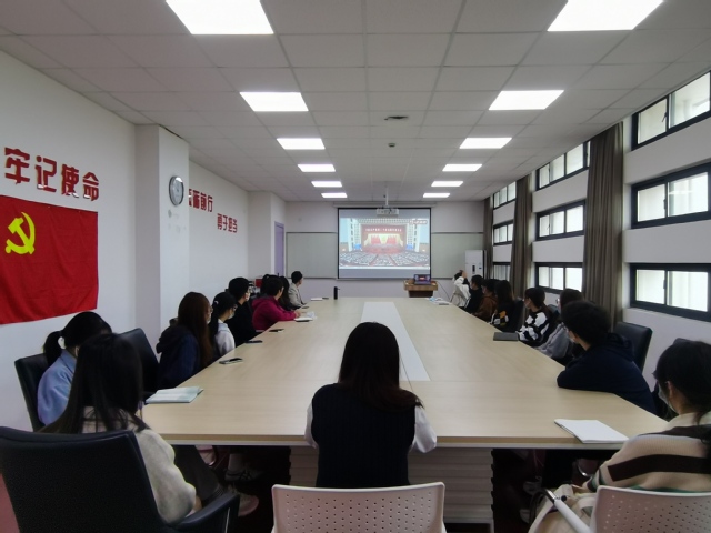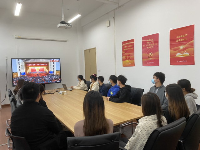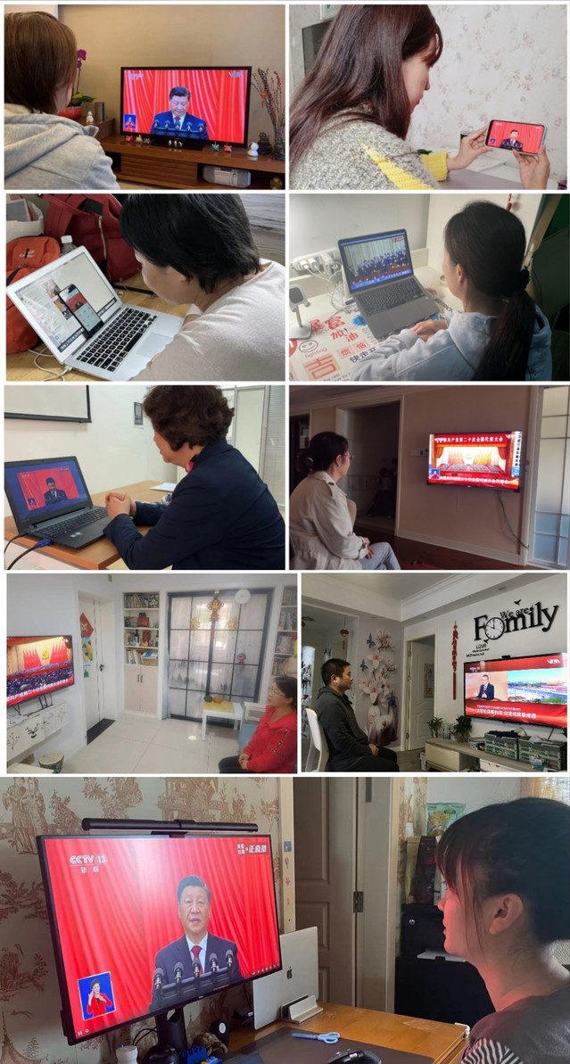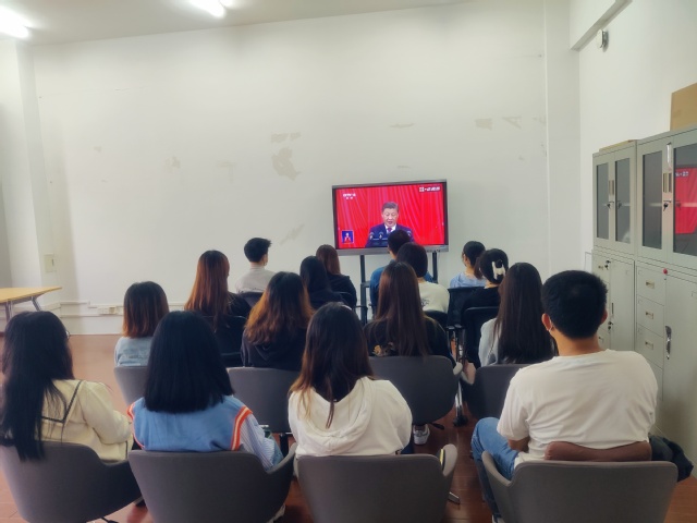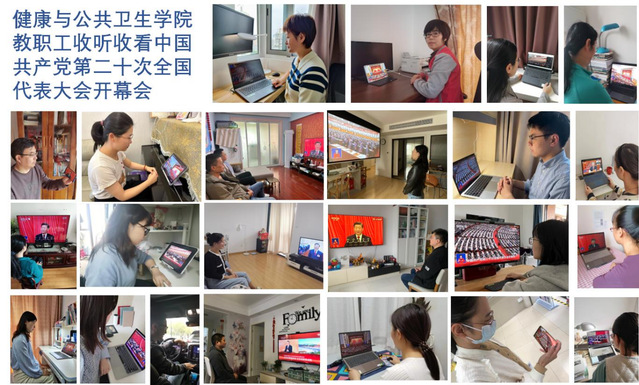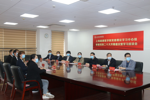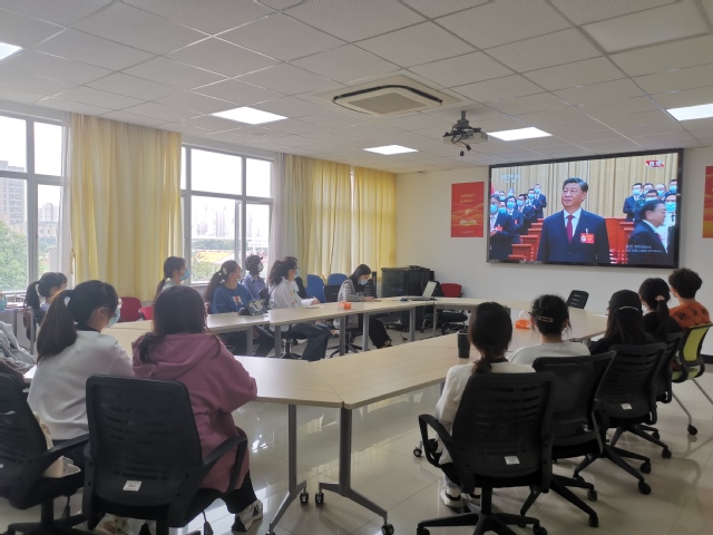 上海健康医学院师生们认真收看党的二十大开幕会盛况。