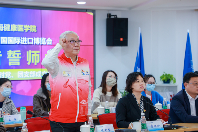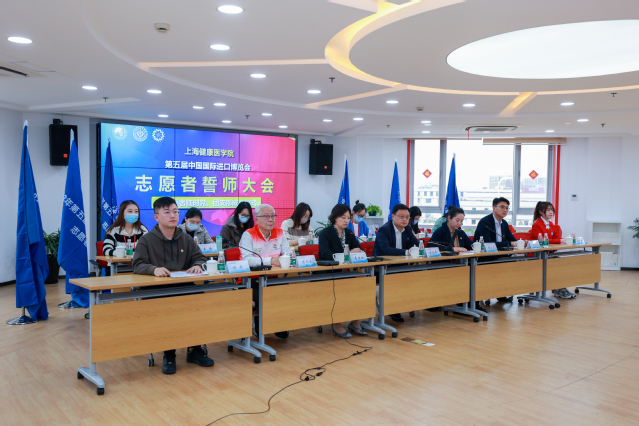 10月26日下午,上海健康医学院第五届中国国际进口博览会志愿者誓师大会暨志愿者临时党、团支部成立仪式在线上线下同步举行。上海健康医学院党委常委、宣传部部长李兆伟,校党委组织部副部长詹浩玲,团市委、市希望工程和青年志愿者指导中心合作联络部部长姚舜,护理与健康管理学院党总支副书记薛文正,校青年志愿者协会指导教师傅向东,校团委马志波,我校各部门,各学院相关负责人、学院团总支书记以及95名第五届进博会志愿者参与活动。校团委挂职干部林剑主持大会。