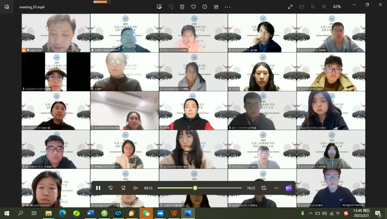 2023年寒假期间,由上海健康医学院国际教育学院和外语学部联合主办首届国际传播力冬令营在线上举办。1月29日开营,迎来了来自本校的国内外近150多名学生参与,尤其是国际教育学院来自哈萨克斯坦、吉尔吉斯斯坦、泰国、土库曼斯坦、老挝、博兹瓦纳、乌克兰、日本、蒙古、尼泊尔、摩洛哥、尼日利亚、南非、巴基斯坦等国际学生的积极参与,来华留学生和在校学生共同体验了上海健康医学院国际传播力提升之旅的魅力。