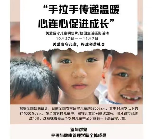 护理与健康管理学院于10月27日至11月7日举办了为期12天的“手拉手传递温暖,心连心促进成长”的公益活动。本次公益活动主要分为明信片寄语与校园摄影两种形式,旨在推动大学生开展公益实践,弘扬公益精神、宣传公益文化、开展公益实践,并加强改进大学生思想政治教育,丰富校园文化。学院共计551名同学参与其中,共计捐赠儿童图书353本。