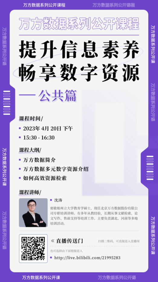 凛冬散尽,暖风和煦,伴随着春天的脚步,我校图书馆联合万方数据库特别推出“提升信息素养,赋能科研学习”系列线上直播讲座,将从平台简介、资源介绍、终端应用等多个维度,帮助大家更好的利用万方数据知识服务平台的资源,提升用户在精准发现、获取与分析、沉淀学术信息等方面的能力,助力科研论文、学术论文的撰写,促进科技创新、拓展发现新领域。欢迎我校师生积极参与。