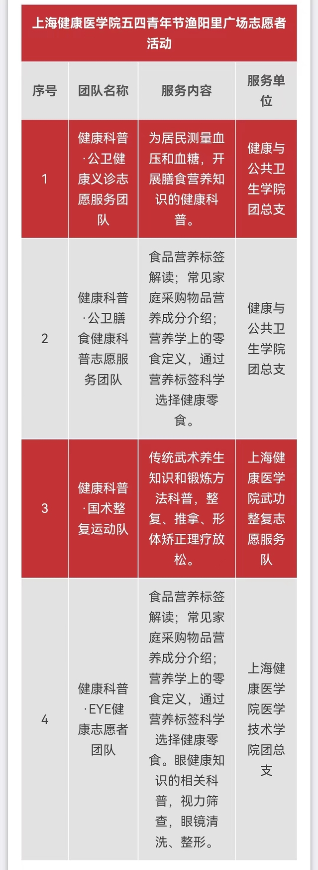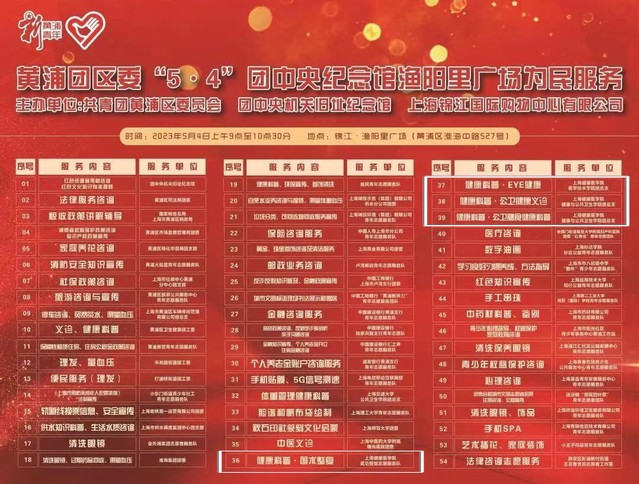 本次志愿服务活动以健康科普为主题,共有公卫健康义诊志愿服务团队、公卫膳食健康科普志愿服务团队、国术整复运动队、EYE健康志愿者团队四支志愿者队伍,开展包括测量血压和血糖,膳食营养知识健康科普;食品营养标签解读,通过营养标签科学选择健康零食;传统武术养生知识和锻炼方法科普,整复、推拿、形体矫正理疗放松;眼健康知识的相关科普,视力筛查,眼镜清洗、整形等志愿服务活动,创新健康科普载体,广泛开展健康知识宣传,提高居民的健康意识和健康知识知晓率,为助力健康中国贡献青春力量。
