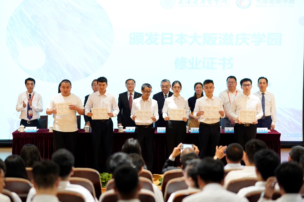 接着,桥本胜信理事讲述了大阪滋庆学园与学校的合作历程,并隆重介绍了该专业留日学生在大阪取得的成绩,欢迎毕业生到大阪滋庆学园留学研修;医疗器械学院胡兆燕院长在致辞中,希望同学们“不忘初心”,勉励大家“爱国奋斗、求真力行、互鉴包容”,并诚邀学生常回“家”看看,以不同形式关心和支持母校的建设和发展。