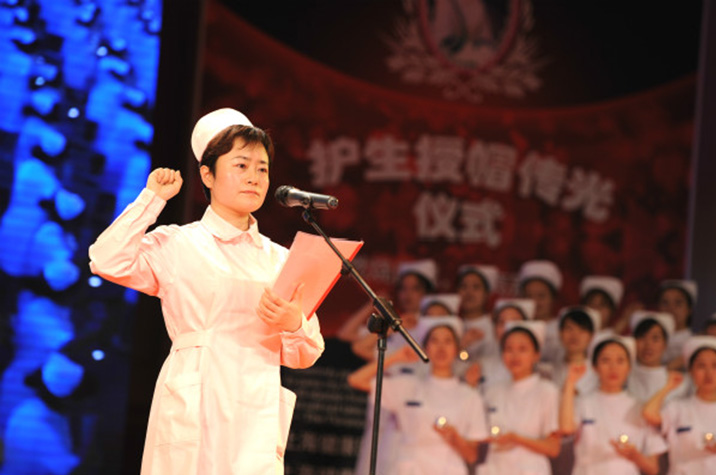 在《平安夜》庄严而优美的乐曲中,授帽仪式正式开始,上海市护理质控中心主任施雁老师点燃象征生命之光的红烛。一群手捧烛火的白衣天使缓缓走上舞台,中山医院护理部主任徐建鸣、华山医院护理部主任蒋红、上海市第五人民医院副院长杨青敏、上海健康医学院徐汇校区教授余剑珍、上海健康医学院浦东校区现代护理职教中心主任戴鸿英、肿瘤医院护理部主任陆箴琦、儿童医院护理部主任龚梅、普陀人民医院护理部主任于井子、大华医院宣飞燕工作室副主任宣飞燕和护理系20名教师为即将走上实习岗位的护生们进行授帽。685名学生穿上最美的衣装,戴上圣洁的燕帽,洁白的燕帽下闪烁着同学们坚定的目光,无暇的护士服中拥裹着白衣天使们高尚的情怀。随后男护生代表手捧鲜花上台,向这些兢兢业业、勤勤恳恳、甘于平凡的天使榜样们献礼,表达心中对前辈们的无限崇敬。之后由行业劳模于井子老师带领护士诵读南丁格尔誓言,一句句掷地有声的誓言在摇曳的烛光中荡漾,庄严的氛围净化和感动着在场每个人的心灵,让大家深深感受到了白衣天使这个职业的崇高和光荣。
