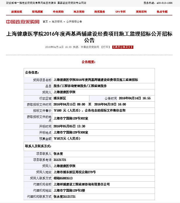 上海健康医学院2016年度两基两辅建设经费项目施工监理招标公开招标公告