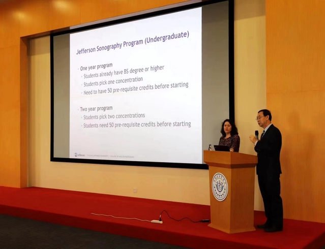 美国托马斯•杰斐逊大学一行首先参观了我校现代医学教育博物馆、影像楼超声及CT实训室和分子影像重点实验室。Michael Dryer教授对我校的发展理念、建设水平、体现的医学人文精神表示高度赞赏。同时,健康人文科学学院终身教授刘吉斌、副教授Traci B.Fox为医学影像学院学生作了关于超声检查技术发展的精彩讲座。