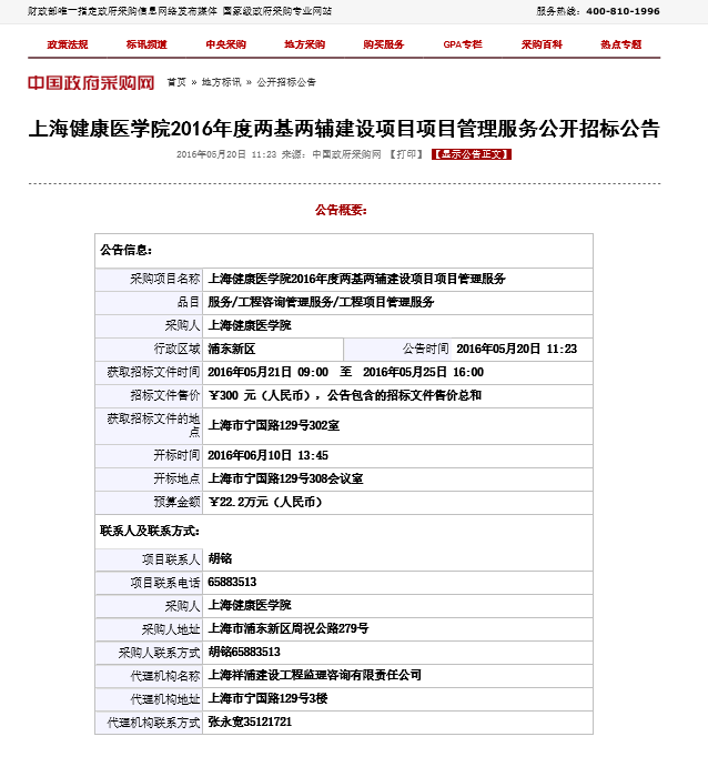 上海健康医学院2016年度两基两辅建设项目项目管理服务公开招标公告