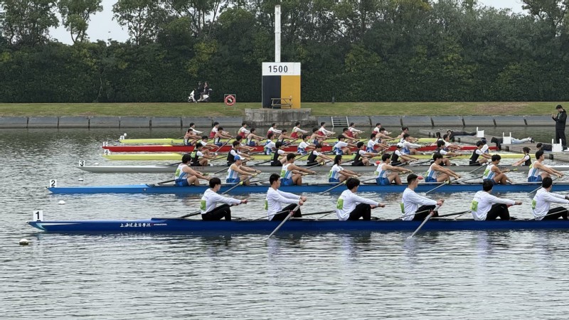 首先进行的男子八人单桨有舵手2000米比赛,汇聚了同济大学、上海立信会计金融学院等多支传统强队。八人单桨有舵手项目,每一队由八名桨手和一名舵手组成,每名桨手持一条桨,背朝船的前进方向坐于船上,四条桨在左,四条桨在右。它是赛艇运动中艇身最长、人数最多、速度最快和最具有观赏性的项目。
