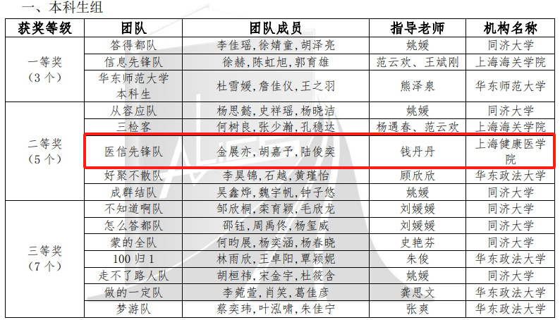 2024年大学生信息素养大赛(上海赛区)选拔赛自6月份开始报名,历时5个月,初赛暨校级选拔赛共吸引了上海市11所高校535名本科生和研究生报名参赛,共选拔了30支队伍共90名学生晋级上海赛区选拔赛,分为“淘汰赛”和“决赛”两个阶段,经过一个多月的精彩比拼,最终有18支队伍在比赛中取得了优异的成绩,其中本科生组15支,研究生组3支。由金展亦(临床医学院)、胡嘉予(健康与公共卫生学院)、陆俊奕(临床医学院)三位同学组成的“医信先锋队”凭借出色的表现和优异的成绩,赢得了评委的一致好评。