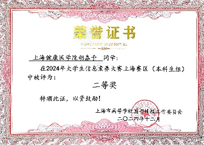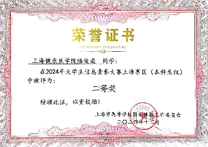 12月5日,2024年大学生信息素养大赛圆满落幕,我校参赛队伍在本次大赛中表现出色,荣获了上海赛区(本科生组)二等奖的优异成绩。此次大赛由重庆市教育委员会、四川省教育厅指导,大学生信息素养大赛组织委员会主办,上海市高等学校图书情报工作委员会协办,旨在推进教育强国、科技强国、人才强国建设,提高大学生的创新精神和实践能力。