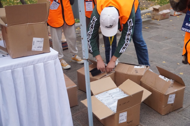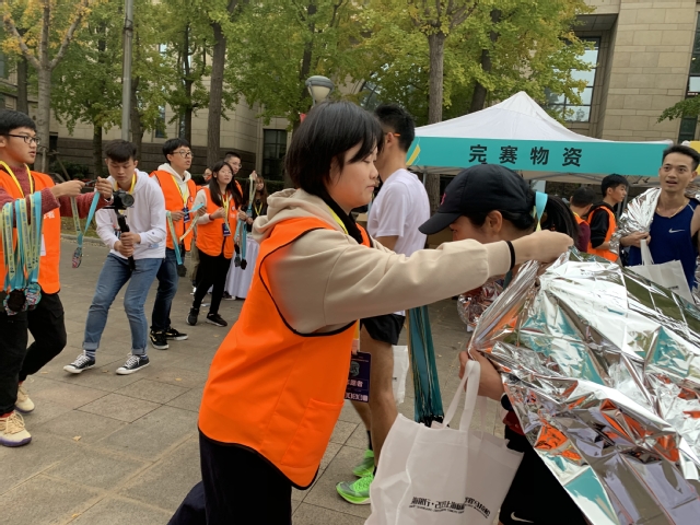 欢乐跑终点组:欢乐跑的整体氛围,比半程马拉松选手轻松很多。同学们主要为选手分发赛包和奖牌,并进行赛道指引以及出口指引。