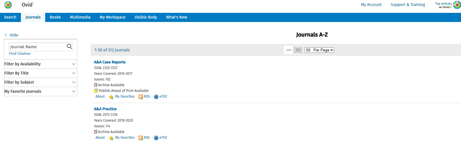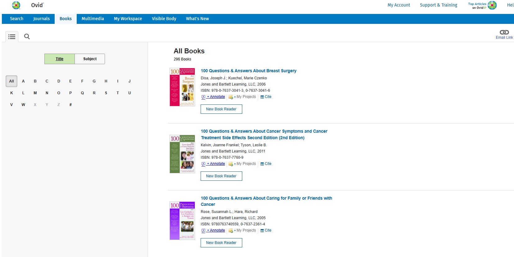 登录OVID平台,勾选Books@Ovid和Search Shanghai University of Mdeicine&Health Sciences Full-Text Journals,点击上方Journals或Books标签,即可打开所有期刊列表和电子书目列表。