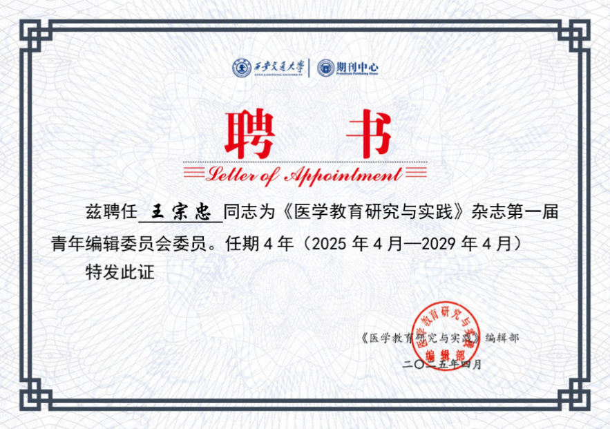 《医学教育研究与实践》杂志由教育部主管、西安交通大学主办,创刊于1982年,知网影响因子为1.736,是我国医学教育领域的导向性刊物,此次青年编委会的成立旨在进一步凝聚医学教育领域专家的学术优势,引领医学教育创新发展,促进复合型医学创新人才培养和学科建设。王宗忠老师的成功入选表明我校在青年教师培养以及医学教育学术研究领域取得新突破,也将不断提升我校在国内医学外语教育研究领域的学术影响力。