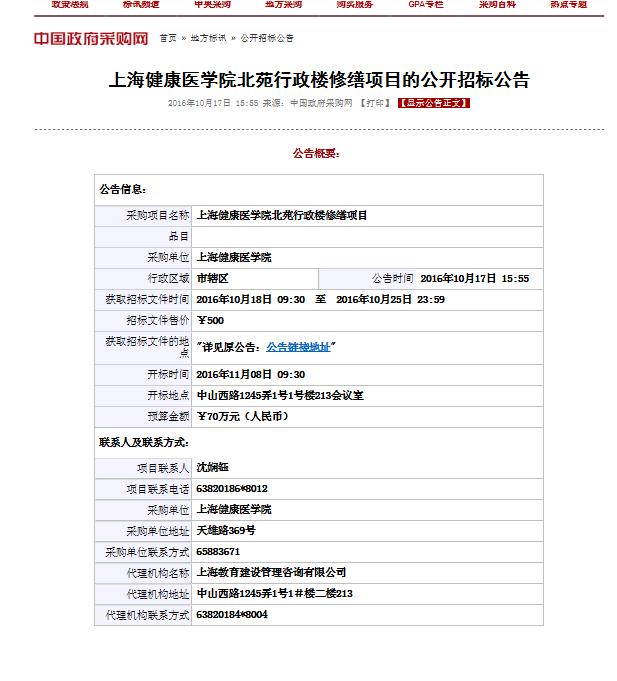 上海健康医学院北苑行政楼修缮项目的公开招标公告