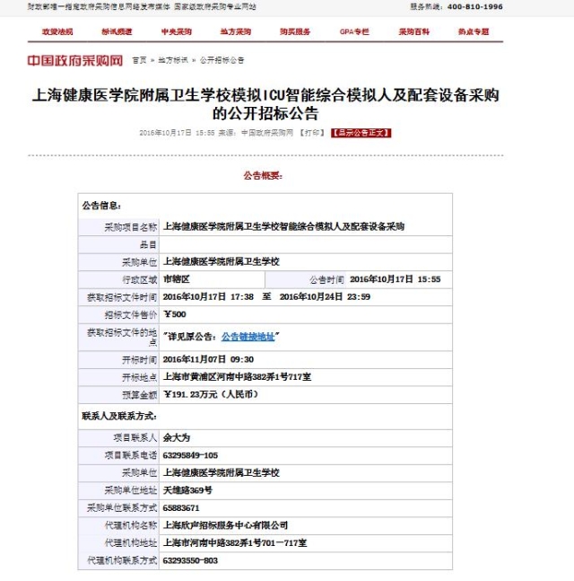 上海健康医学院附属卫生学校模拟ICU智能综合模拟人及配套设备采购的公开招标公告