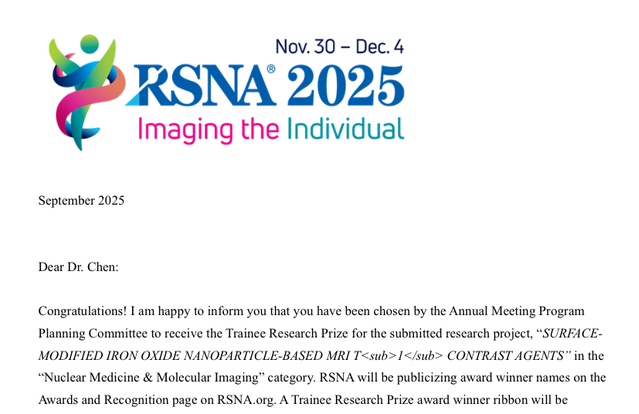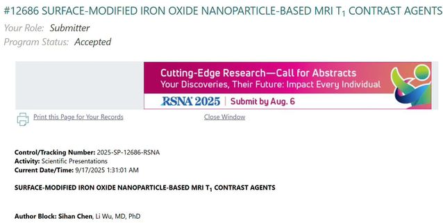 近日,国际放射学领域顶级学术会议——北美放射学会(RSNA)2025年年会公布获奖名单,由上海健康医学院医学影像学院吴励副教授指导,上海健康医学院与上海理工大学联合培养的2024级医学影像技术专业硕士研究生陈思涵作为第一作者、吴励副教授作为通讯作者的研究成果《Surface-modified Iron Oxide Nanoparticles-based MRI T1 Contrast Agents》荣获“Trainee Research Prize”。该研究成功入选大会壁报展示,并从全球数万篇投稿中脱颖而出,斩获此项国际殊荣,充分展示了我校师生在医学影像前沿领域的创新活力与科研实力。