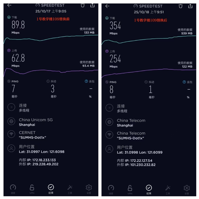 此外,针对师生反映的东苑无线网络速率较慢的问题,技术团队对东苑无线网络的覆盖范围、设备运行参数以及用户接入状况进行了全方位监测与分析,完成了东苑70余个无线设备的升级。升级后的实测数据显示,东苑无线网络的效率较之前提升了四倍,可显著改善教师在线备课、课件传输的效率,优化学生课堂互动和在线学习的体验。