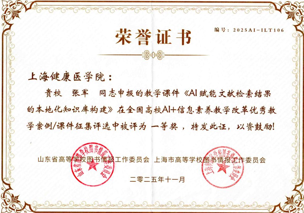 近日,由山东省高等学校图书情报工作委员会、上海市高等学校图书情报工作委员会联合主办的“全国高校AI+信息素养教学改革优秀教学案例/课件征集评选”结果正式揭晓。我校图文信息中心张军老师的课件《AI赋能文献检索结果的本地化知识库构建》,从全国101项有效申报中脱颖而出,成功斩获课件组一等奖,用扎实的教学创新成果为学校赢得了全国性荣誉。充分体现了我校在信息素养教育与人工智能融合方面的前沿探索实力与扎实教学创新水平。