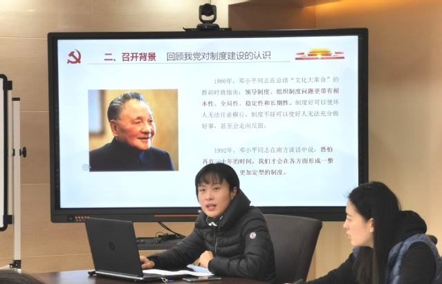 十九届四中全会是在以习近平同志为核心的党中央坚强领导下,贯彻落实党的十九大精神,坚持和完善中国特色社会主义制度、推进国家治理体系和治理能力现代化的一次重要会议。本次中心组学习由党总支宣传委员、党政综合办主任朱燕玲领学。她从会议概述、历史背景、会议重点、战略意义、心得体会五个方面解读了十九届四中全会内容,使在座的党员对中国特色社会主义制度和国家治理体系的显著优势、坚持和完善中国特色社会主义制度、推进国家治理体系和治理能力现代化的总体要求和总体目标有了更全面和详实的了解。