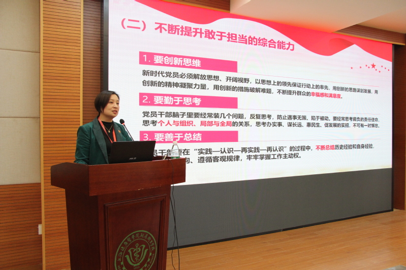 11月12日下午,围绕 “责任担当”,附属卫校党总支书记钱艳以“锤炼担当的政治品格,在实践中践行初心和使命”为题,给全体党员上了一堂深刻的党课,将主题教育引向深入。校领导、全体党员干部及主题教育工作小组成员参加会议。