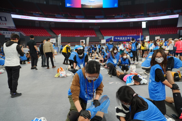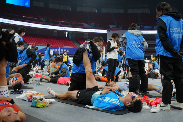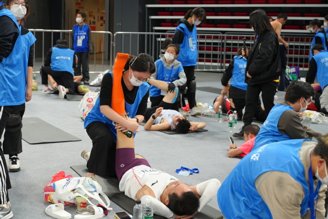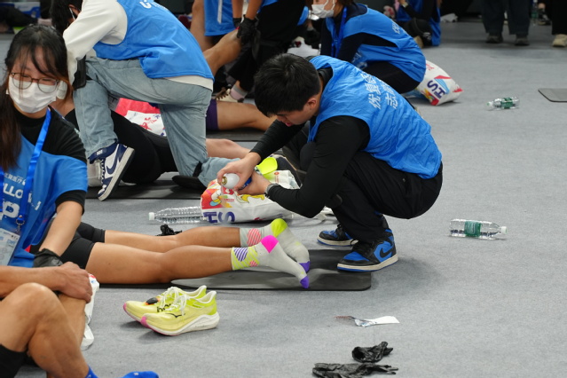 随着跑者陆续抵达终点,志愿者们迅速进入状态。他们运用在校所学的康复知识与手法,耐心地为疲惫的跑者进行腿部肌肉的松解与拉伸,每一个动作都严谨而温柔。现场,随处可见志愿者们单膝跪地,全神贯注地工作,而跑者们从最初因肌肉酸痛而紧锁眉头,到最终舒展身体、露出轻松微笑的画面,则是对志愿者们辛勤付出的最高赞誉。