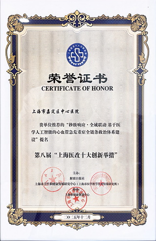 日前,第八届“上海医改十大创新举措”正式揭晓。我校附属嘉定区中心医院“秒级响应·全域联动 基于医学人工智能的心血管急危重症全链条救治体系建设”获提名奖。
