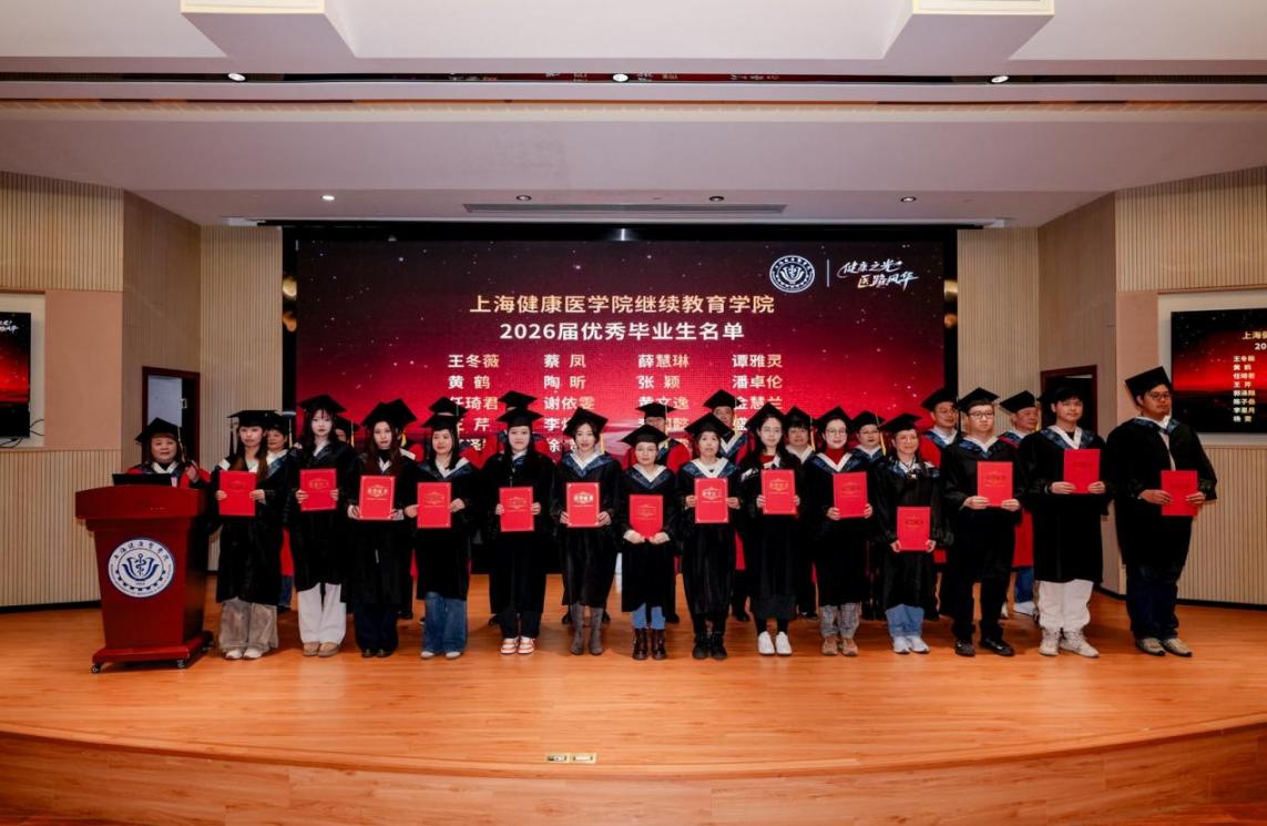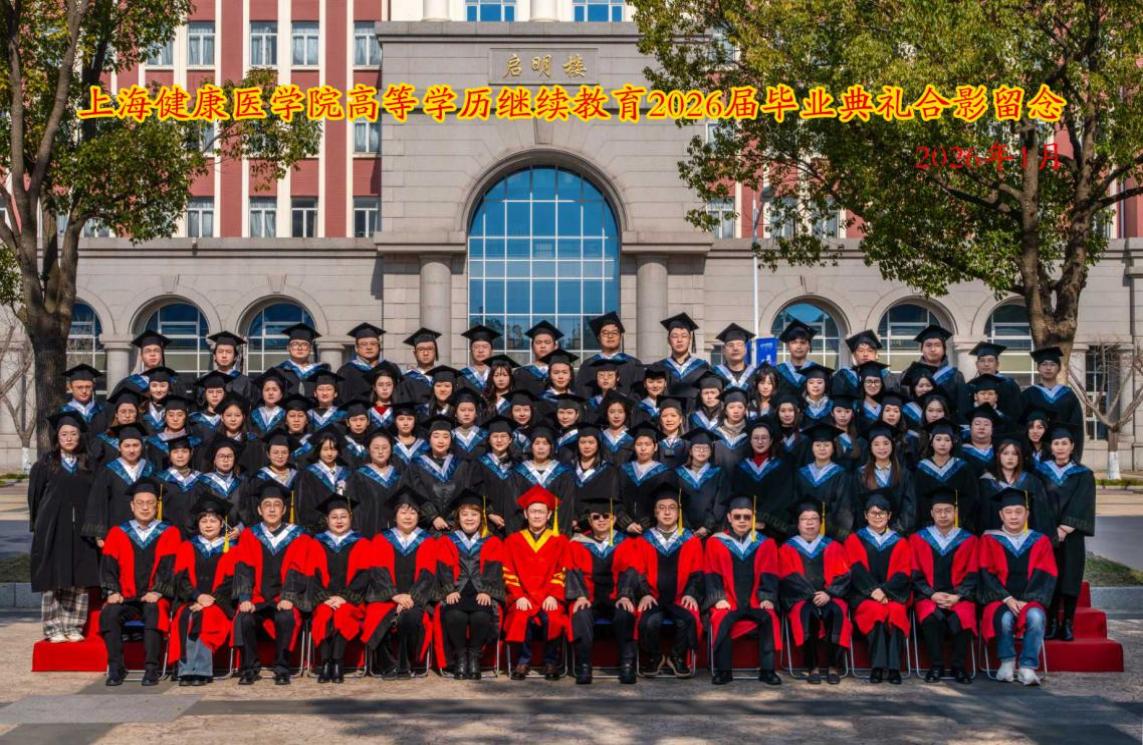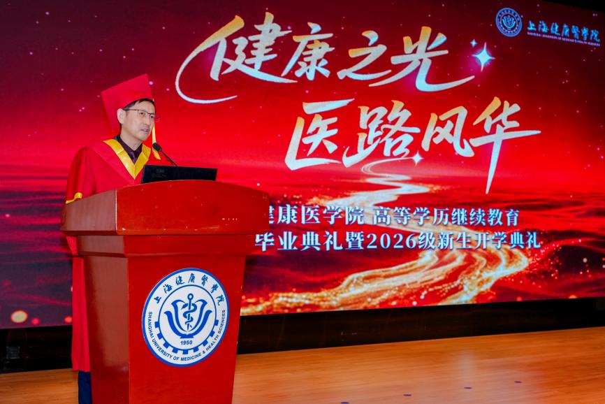 2026年1月10日上午,上海健康医学院高等学历继续教育2026届毕业典礼暨2026级新生开学典礼在北苑200人报告厅举行。上海健康医学院副校长汤磊、护理与健康管理学院院长朱爱勇、药学院党总支书记徐一新、医学技术学院党总支书记姚谷芳、康复学院院长郭琪、医疗器械学院院长杨晖、医学影像学院院长李晓欧及各教学点负责人、教师代表、毕业生代表与新生代表共同见证这薪火相传的重要时刻。典礼在校官方视频号进行了同步直播,由继续教育学院院长张美蓉主持。