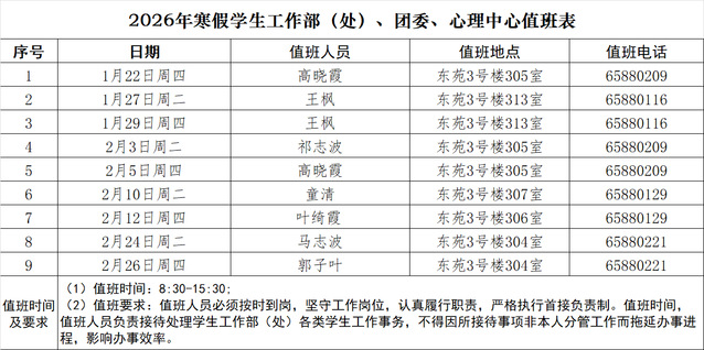 2026年寒假学生工作部(处)、团委、心理中心值班表