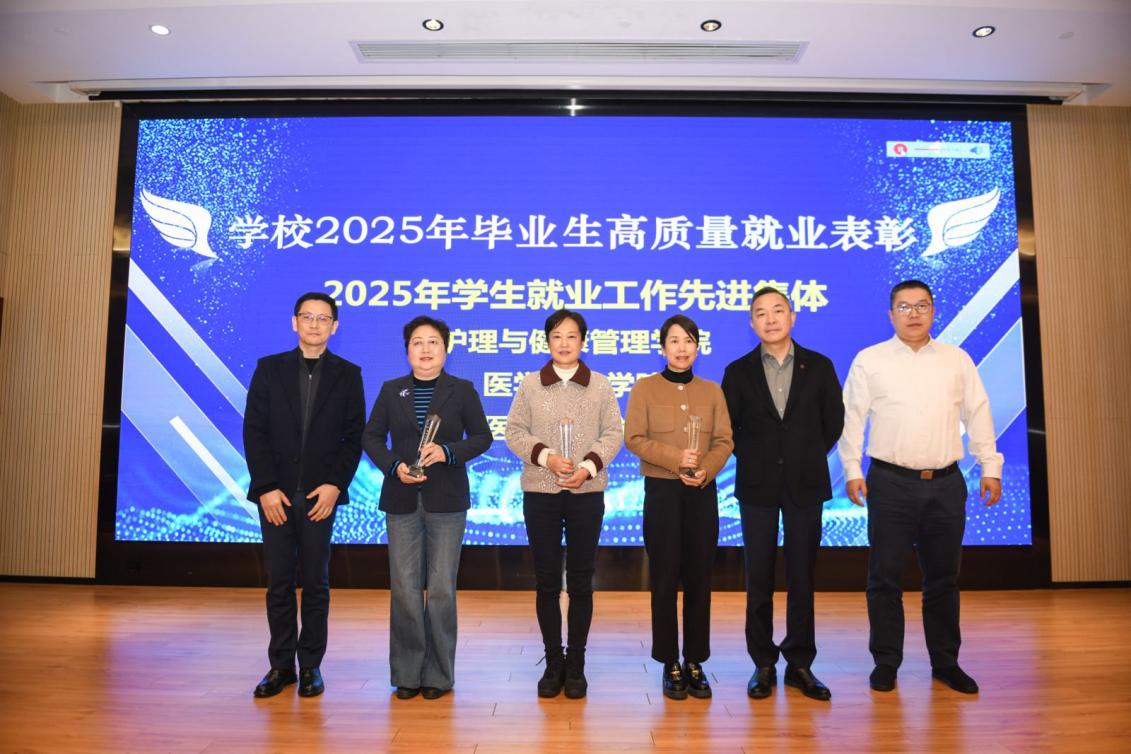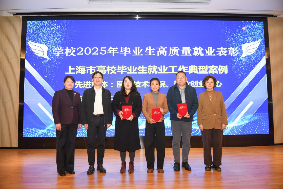 党委副书记唐红梅,党委副书记、副校长王庆华,党委副书记、纪委书记周宁慧为荣获2025年上海市高校毕业生就业工作典型案例的集体——医学技术学院、就业创业中心颁奖,并为获评个人护理与健康管理学院李影颁奖。