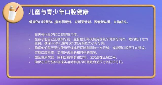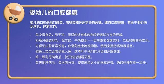围绕婴幼儿、儿童与青少年、成人、老年人四个年龄段,世界牙科联盟(FDI)分别提出了清晰明确的口腔健康指导。从第一颗乳牙的呵护到老年期的功能维护,这些建议涵盖了生命不同阶段的照护重点与实用细节。以下内容带您快速了解,在人生的每一个阶段,如何用科学的方式守护口腔、守护全身健康。