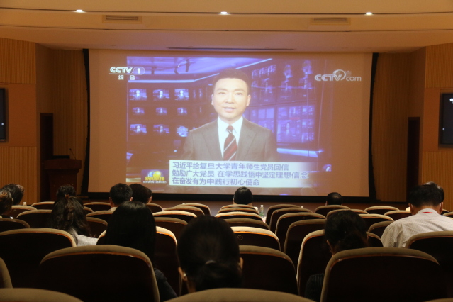 6月30日在学校北苑200人报告厅,全体校领导、党务部门负责人、各党总支、直属党支部书记、教师代表、学生代表集体观看中央电视台一频道晚间《新闻联播》节目,认真学习习近平总书记给复旦大学《共产党宣言》展示馆党员志愿服务队全体成员的回信精神。四位同志就学习习近平总书记回信精神,结合实际谈了体会。党委副书记、校长黄钢主持会议。