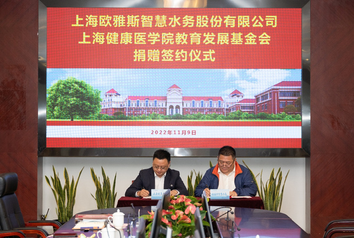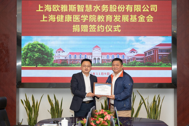 在全体与会人员的见证下,李兆伟与高天放代表双方签署捐赠协议,并为欧雅斯水务颁发捐赠证书和感谢信。根据协议,欧雅斯水务捐赠人民币100万元,以支持上海健康医学院关于饮用水光催化降毒提质的研发工作。