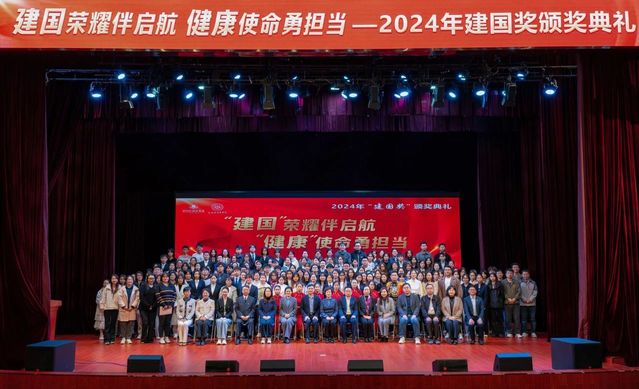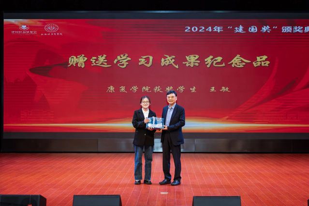 初冬暖阳,2024年11月21日下午,上海健康医学院教育发展基金会(以下简称教育发展基金会)在上海健康医学院北苑400人报告厅隆重举行“建国荣耀伴启航,健康使命勇担当”2024年“建国奖”颁奖典礼。学校党委副书记、副校长唐红梅;上海市建国社会公益基金会(以下简称建国基金会)、原能细胞科技集团有限公司创始人,开能健康科技集团股份有限公司、上海原能细胞生物低温设备有限公司董事长,教育发展基金会创始理事瞿建国;建国基金会秘书长、原能细胞科技集团董事长庄乾坤;理事长张正苹;党支部书记沈福伟;魏艺曼女士;校党委常委、宣传部部长、教育发展基金会理事长李兆伟;校友工作办公室副主任、校友会秘书长、教育发展基金会秘书长王红、研究生管理办公室主任胡霞敏;学生处副处长于杨等及获奖学生参加颁奖典礼。