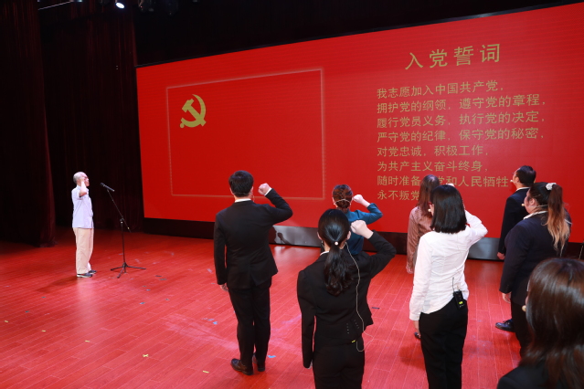 第一篇章,学史明志传薪火,立足岗位守健康。黄钢校长为全体党员上了一堂精心准备的微党课,生动展现了新中国建设以来特别是改革开放以来医学教育的改革发展历程,让我们从历史中汲取精神力量、汲取经验智慧、汲取坚守学校改革发展的定力。临床医学院、护理与健康管理学院老师带来了诗朗诵《薪火相传》,很好展现了学校紧贴社会经济发展,满足基层卫生健康服务需求,培养“下得去,干得好,留得住”的基层卫生健康“守门人”,在党和人民最需要的地方绽放青春之花。接着,退休党员、上海市志愿者达人傅向东老师领誓,12名师生新党员庄严宣誓,全体党员重温入党誓词。