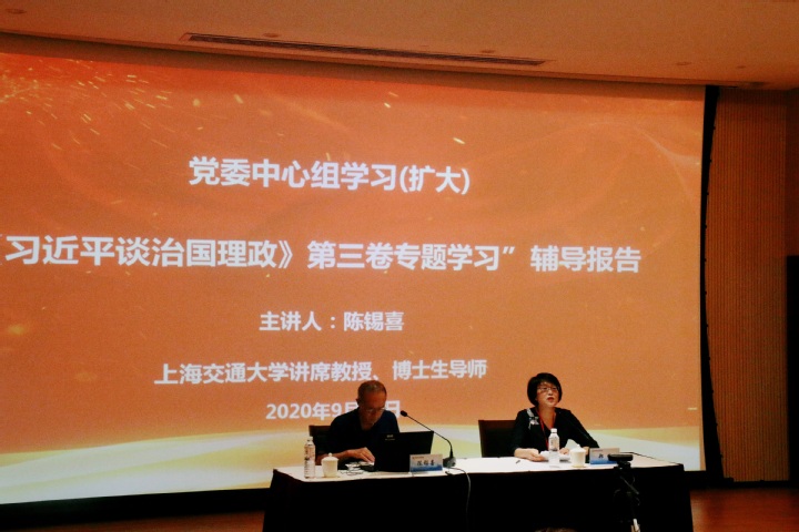 9月16日下午,上海健康医学院党委中心组(扩大)围绕《习近平谈治国理政》第三卷在200人报告厅进行首场集体学习。上海交通大学讲席教授、博士生导师、中央马克思主义理论研究和建设工程首席专家陈锡喜教授应邀作专题辅导报告。校党委书记郑锦主持会议并讲话,全体中心组成员、马克思主义学院教师在主会场参加学习,全体辅导员通过线上分会场参加线上学习。