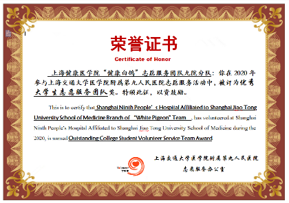 我校团委青年志愿服务工作荣获团市委通报表扬《关于对2019年度部分基层团组织青年志愿服务工作予以通报表扬的决定》(沪团委〔2020〕1号)。未来,在校团委和各培育基地的共同努力下,“健康小橘子”们会再接再厉,将“传承•创新”、“高效•团结”、“热情•友爱”、“互助•奉献”的上海健康医学院志愿者精神与医学提倡的“责任、奉献、协作、人道主义”的职业精神相结合,打造富有“健康”特色的志愿服务品牌,为健康中国战略实施和健康上海建设贡献青春力量。
