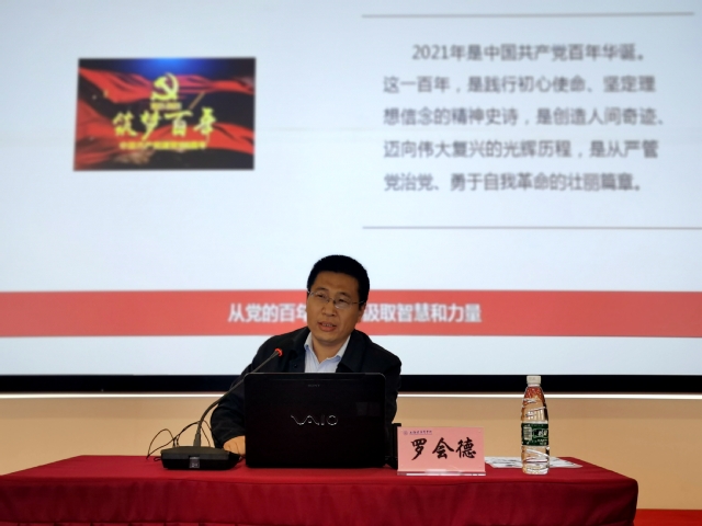 罗会德教授以中国共产党作为百年大党恰是风华正茂的“青春密码”引入,阐述了党在革命、建设、改革中始终勇立潮头,走在时代前列的根本原因,在于党能够始终不断地锻造和锤炼了“铁一般信仰、铁一般信念、铁一般纪律、铁一般担当”的有机体,从而保持了昂扬向上的精神状态。他从“何谓中国共产党的初心”、“中国共产党为什么能永葆朝气”、“中国共产党如何永葆朝气”三个方面,详细解读了我们党是如何在这一百年间,践行初心使命、坚定理想信念,创造人间奇迹,严格管党治党、勇于自我革命,坚持为中国人民谋幸福、为中华民族谋复兴,使中国昂首迈步在伟大复兴的光辉大道之上,在中国共产党百年华诞之际,绘就壮丽篇章。