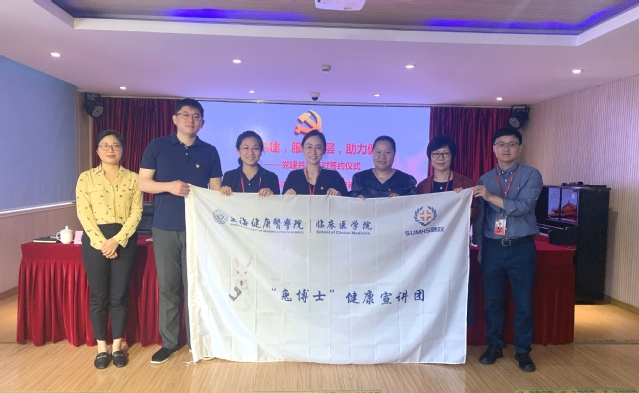 为坚持党建带团建,加强协同育人实效,推动团员青年结对,促进双方青年团员的交流,临床医学院团总支组建“上海健康医学院临床医学院兔博士健康宣讲团”,持续开展急救知识宣讲普及活动。罗瑾琰和周南社区中心办公室主任秦丹为临床医学院团总支授旗。