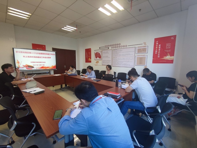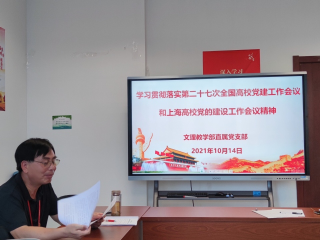 根据上海高校党的建设工作会议要求,结合我校关于贯彻落实上海高校党建工作会议精神做出的工作部署,文理教学部直属党支部于10月14日下午召开了题为“认真传达学习贯彻落实第二十七次全国高校党建工作会议和上海高校党的建设工作会议精神”的主题党日活动,党支部书记秦禹权主持并领学第二十七次全国高校党的建设工作会议和上海高校党的建设工作会议精神,深刻把握中央、市委、教卫党委关于高校党的建设的重大决策部署,并围绕讲话精神、结合教学部实际,全面贯彻党的教育方针,坚持以党建高质量引领新时代教学部高质量发展,认真落实立德树人根本任务,努力办好人民满意的高等教育,培养德智体美劳全面发展的社会主义建设者和接班人。