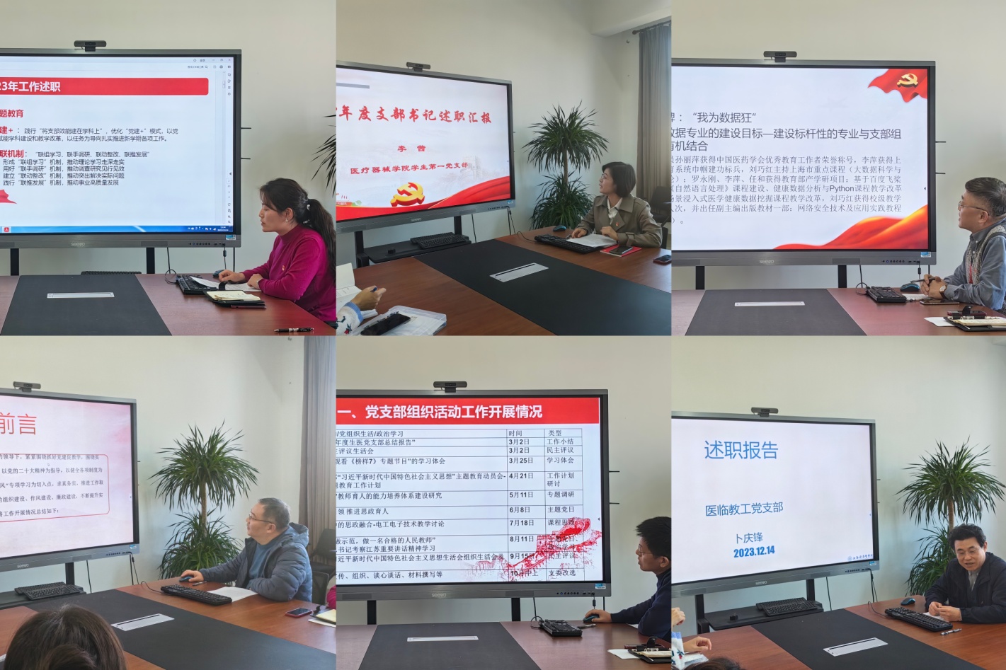述职评议会上,学生第二党支部书记荀琳、实训教工党支部书记商怀超、学生第一党支部书记李茜、生医教工党支部书记陈永强、信息教工党支部书记罗永刚和医临教工党支部书记卜庆锋依次分别围绕学习贯彻习近平新时代中国特色社会主义思想主题教育、党员教育管理、党组织生活、支部品牌建设、本科教学工作合格评估期间党支部和党员作用发挥等党支部2023年党建工作进行汇报,六位党支部书记在认真总结本年度落实履行职责情况的基础上,深入查摆现存问题,逐一对工作中的短板进行梳理,并对2024年度党支部工作提出了改进目标。