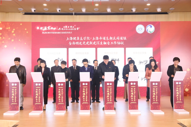 在签约仪式上,杨伟人、吕东胜上台签订上海健康医学院与上海市浦东新区周浦镇全面推进党建联建深度融合工作协议,上海健康医学院7个党总支与周浦镇7个社区党委党建联建签约,市教卫工作党委书记沈炜、市教卫工作党委二级巡视员杨伟人(主持学校党委工作)、上海健康医学院党委副书记、校长黄钢、上海健康医学院党委副书记于莹、浦东新区教育工作党委书记、浦东新区教育局局长诸惠华、浦东新区组织部副部长徐可畏、周浦镇党委书记吕东胜为签约见证。签约仪式标志着双方全面战略合作站到一个新的起点,开启社区(村居)与各学院部党组织全覆盖结对的新局面。