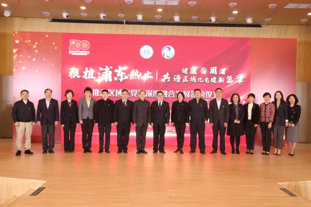 市教卫工作党委书记沈炜、浦东新区教育工作党委书记、浦东新区教育局局长诸惠华、浦东新区组织部副部长徐可畏出席仪式。上海健康医学院与周浦镇全体党政班子,双方各职能部门负责人代表、基层党组织书记代表、大中小思政课一体化学校代表、周浦惠民医疗党建联盟成员单位负责同志150余人参加仪式。上海健康医学院党委副书记、校长黄钢主持签约仪式。