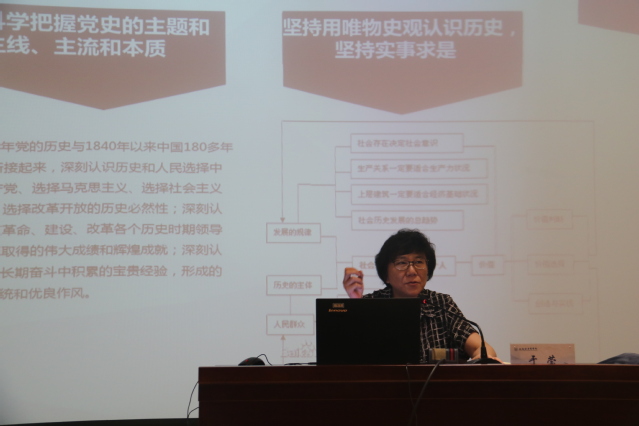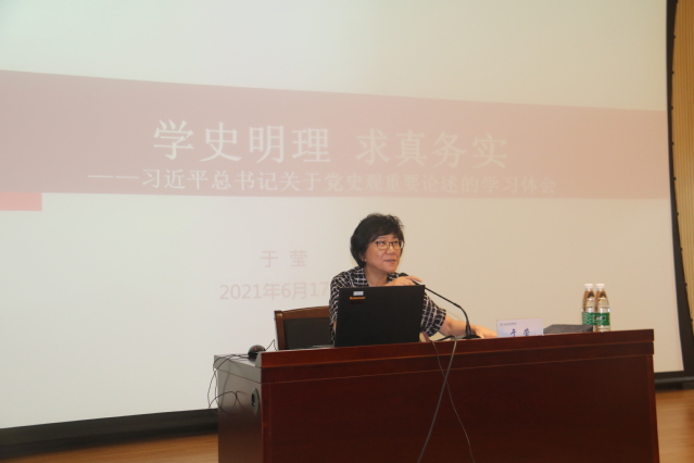 首先,于莹以习近平总书记生动形象的“妙喻”阐述开展党史学习教育重大意义为序,引出习近平总书记关于历史观的重要论述,使全体党员深刻认识到习近平总书记用唯物史观认识历史的鲜明立场和我们党一贯坚持的实事求是思想路线。接着,她以时间为轴,引用习近平总书记在西柏坡、井冈山、参观《复兴之路》展、延安杨家岭、遵义会议、古田会议等革命圣地参观或调研时的重要讲话,深刻阐释了学史明理和实事求是,引导全体党员深刻理解中国共产党为什么能、马克思主义为什么行和中国特色社会主义为什么好。最后,于莹从“科学把握党史的主题和主线、主流和本质”“坚持用唯物史观认识历史,坚持实事求是”“与正在做的事情紧密结合起来,做实实在在的业绩”三个方面谈了党史观学习体会,希望全体教师党员在教书育人过程中,注重课堂话语传播的前效性,抓住思政素材关键点和闪光点,点亮专业学习专注度,引发认知、情感和行为认同,把做人做事的道理、把社会主义核心价值观的要求、把实现民族复兴的理想和责任融入各类课程教学之中。