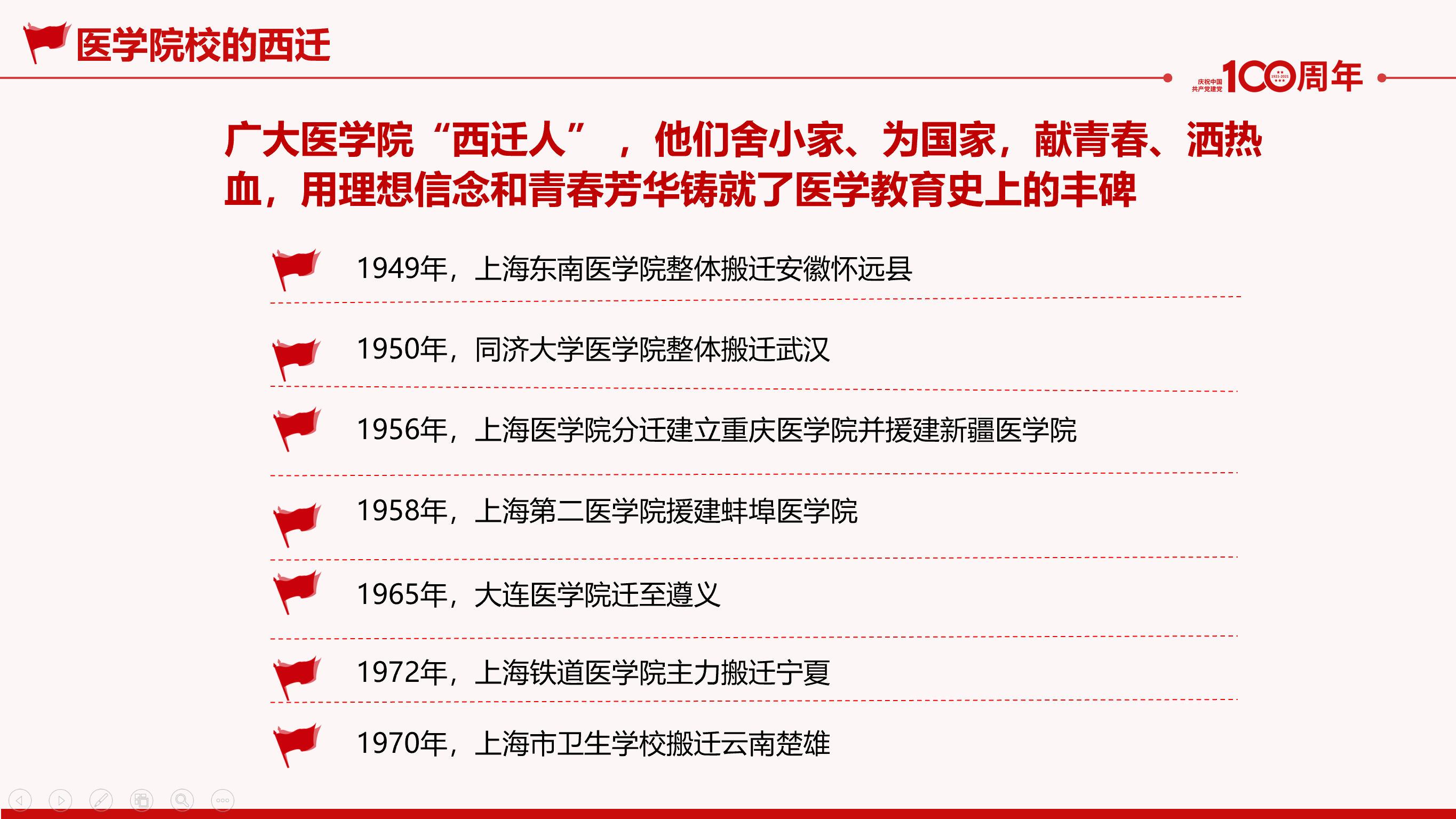 吴韬介绍了新中国成立后全国医学院校的西迁之路,其中包括上海健康医学院前身的上海市卫生学校西迁的相关历史和重要意义。他总结道:无论是“西迁”还是“西援”都是西迁精神的传递,今天的援疆、援藏和志愿者活动也是“西迁精神”的当代传承和生动写照。去年,在抗击新冠肺炎疫情过程中,我校共有262位校友参与了武汉抗疫,他们就是西迁精神的当代缩影。学校自组建以来,在西部地区建立附属医院、选派干部、支援教师、订单培养、招收少数民族预科生,对口支援新疆喀什、云南昆明等地,为祖国西部发展贡献力量,也是西迁精神的弘扬。