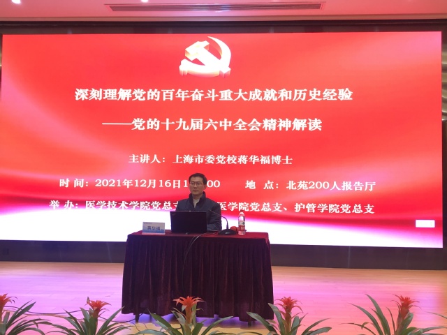 12月16日,医学技术学院党总支、临床医学院党总支、护管学院党总支在北苑200人报告厅联合举办党总支中心组(扩大)政治学习,专题学习党的十九届六中全会精神。会议邀请国家安全与应急管理领域知名专家学者、中共上海市委党校专任教师蒋华福博士作“深刻理解党的百年奋斗重大成就和历史经验——党的十九届六中全会精神解读”专题辅导报告。三个学院的班子成员及全体教职工、学生党员代表参会学习。