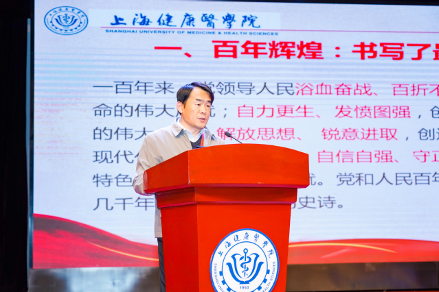 百年征程波澜壮阔,百年初心历久弥坚。为深入学习贯彻党的十九届六中全会精神,深入开展党史学习教育,12月23日下午,上海健康医学院党的十九届六中全会精神师生宣讲团以“胜利和荣光”为题向全校师生展开一场别开生面的宣讲会,让全校师生更好地联系思想实际和工作实际,切实以党的十九届六中全会精神指引行动。本次宣讲会由上海市教卫工作党委理论宣讲团成员、马克思主义学院副院长曹月柱主持,万名师生通过线上线下的方式同看共学,在线上直播平台纷纷发表弹幕积极互动。