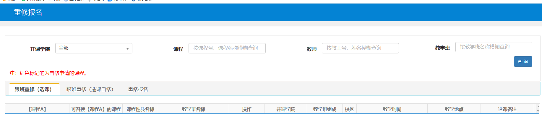 3.跟班重修选课和组班重修申请均在教务系统中选课。
