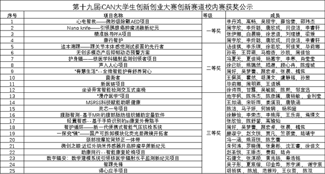 本次校内选拔赛共收到44项作品,遵循公平、公正、公开的原则,经过作品申报、项目初审、专家打分等程序,从产品创意,市场策略,技术方案,原型机制作等方面按照60%的获奖比例,设置一、二、三等奖(其中一等奖4项、二等奖8项、三等奖13项),现将获奖名单公示如下(详见附件)。