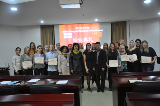 2016年11月17日中午12:30,在北苑一号楼800举行芬兰JEDU职教集团学生结业典礼。此次结业典礼出席人员包括校长唐红梅女士、护理国教联合党总支书记方秀琴、国际教育学院孙海涛副院长、办公室主任陆妍、留学生管理人员邱晨、王敦以及 JEDU16名学生及1名领队老师。在会上,唐校对留学生在这两个月的学习及生活表示赞同和肯定,并寄语他们有更美好的发展。同时,希望他们能爱上中国文化,欢迎他们以后再来上海。JEDU两位学生代表上台发言,对为期两个月的学习表示感谢。通过在爱绿幼儿园、周浦医院的实习,让他们收获很多。中芬两国无论在幼儿园的授课内容还是护理学上都存在差异,但这些都带来新的思想上的冲击,让他们更好的去思考与学习。最后他们还感谢国际教育学院的老师给他们安排如此丰富充实的学习安排,这次上海之行让他们留下深刻的印象。最后的最后,唐校长为学生们颁发结业证书,集体合影,留下美好瞬间。